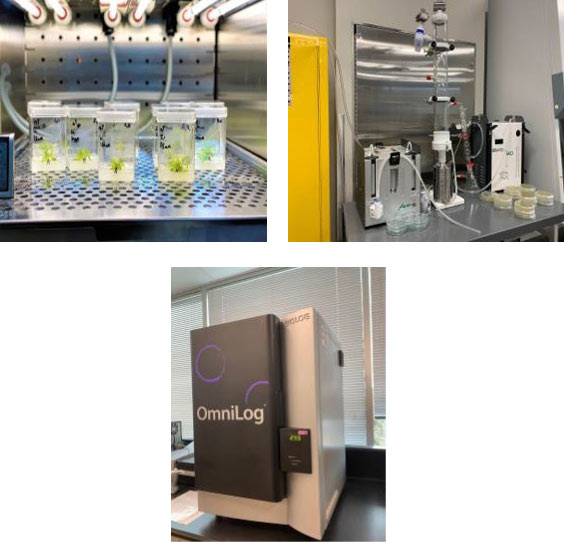 - Un laboratoire pour la culture in vitro (ou culture de tissus) spécialisé dans la production du cannabis, avec plus de sept hottes à flux laminaire pour travailler en condition stérile ainsi que deux chambres de croissance avec des conditions contrôlées. Ainsi, le CAT-B est équipé pour soutenir les entreprises dans l’optimisation des conditions de croissance de plusieurs lignées en quelques mois et ainsi gagner du temps lors de la production.